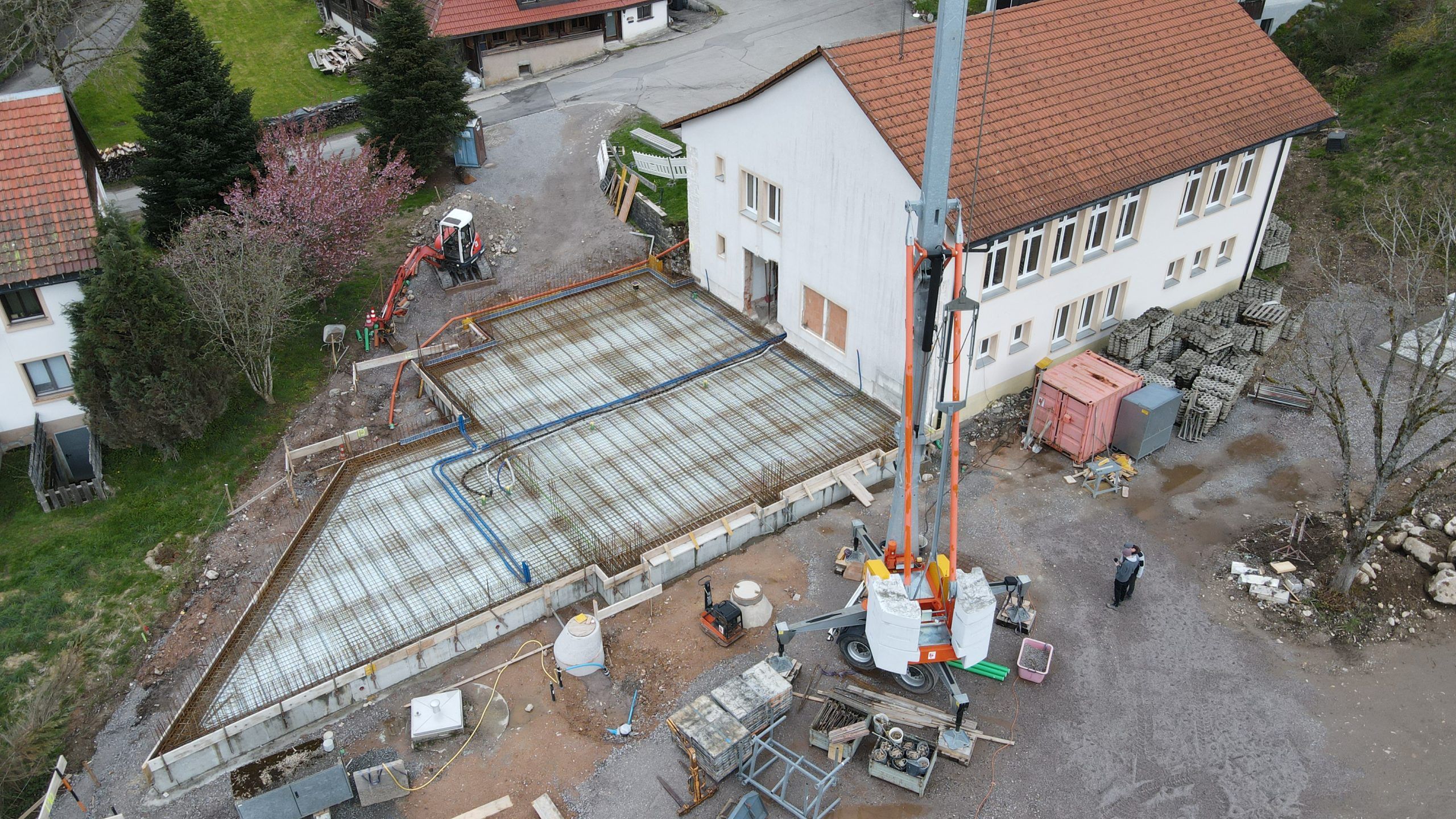Die Erschließung der Fahrzeughalle erfolgt über ein Treppenhaus das ebenfalls in Stahlbetonbauweise vor der Fahrzeughalle errichtet wird. Um das Niveau bei den bestehenden Parkplätzen zu erreichen, wird das Gelände im hinteren Teil aufgeschüttet.